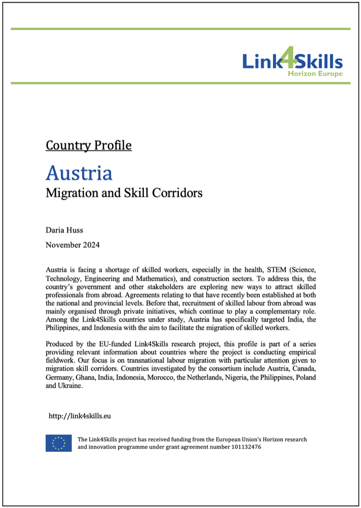 Our Country Profiles provide relevant information about places where Link4Skills is conducting empirical fieldwork on transnational labour migration with a focus on migration skill corridors. Countries investigated include Austria, Canada, Germany, Ghana, India, Indonesia, Morocco, the Netherlands, Nigeria, the Philippines, Poland and Ukraine. New profiles are being added as they become available.